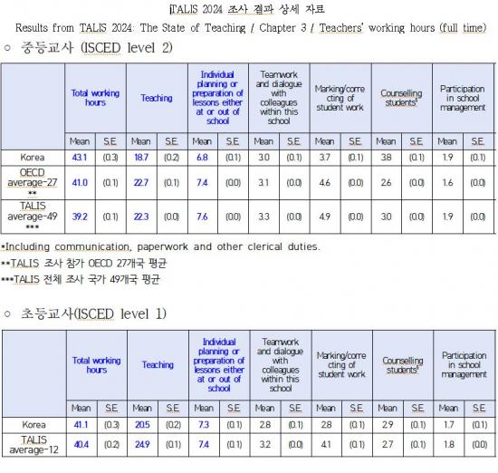 ¡à TALIS 2024¿¡ µû¸£¸é, ¿ì¸®³ª¶ó ÀüÀÓ Áߵ»çÀÇ ÁÖ(ñÎ)´ç ÃÑ ±Ù¹«½Ã°£Àº 43.1½Ã°£À¸·Î OECD Æò±Õ(41.0½Ã°£)º¸´Ù 2.1½Ã°£, Àüü Á¶»ç±¹ Æò±Õ(39.2½Ã°£)º¸´Ù 4.1½Ã°£ ´õ ¸¹¾Ò´Ù.