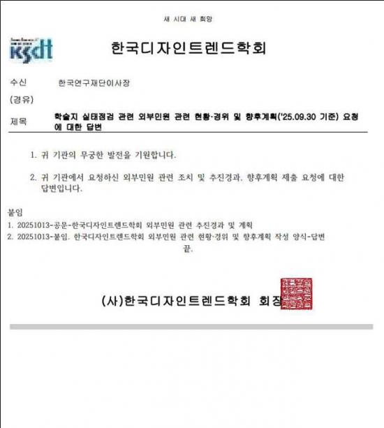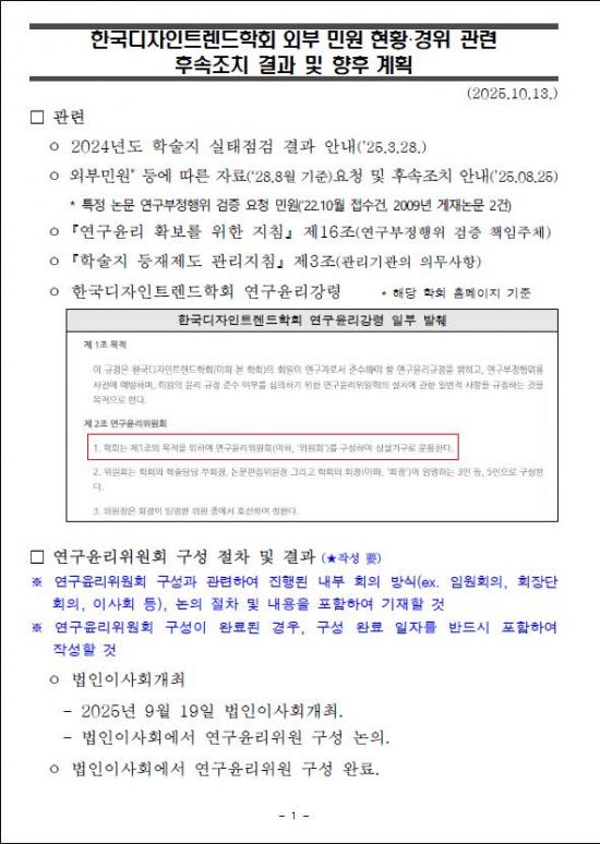 ¡à ¹é½Â¾ÆÀÇ¿ø½ÇÀº ±è°ÇÈñ¾¾ÀÇ À§Á¶‧Ç¥Àý ÀÇȤÀ» ½ÇÀº ÇмúÁö(µðÀÚÀÎÆ÷·³)ÀÇ Çѱ¹µðÀÚÀÎÆ®·»µåÇÐȸ(ÀÌÇÏ ÇÐȸ)°¡ Áö³­ 9¿ù 19ÀÏ ¿¬±¸À±¸®À§¿øÈ¸ ±¸¼ºÀ» ¸¶Ä£ ÈÄ, ¡°10¿ù ÁßÀ¸·Î ¿¬±¸À±¸®À§¿øÈ¸¸¦ °³ÃÖÇØ ±ÔÁ¤¿¡ µû¶ó Á¶Ä¡ÇÒ ¿¹Á¤¡±À̶ó°í Çѱ¹¿¬±¸Àç´Ü¿¡ ȸ½ÅÇÑ »ç½ÇÀ» È®ÀÎÇß´Ù. (÷ºÎ1)